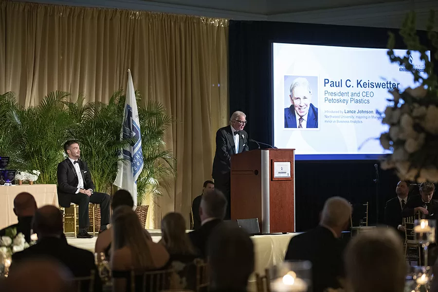 Northwood University student Lance Johnson was chosen to introduce Keiswetter. Johnson said, “Paul learned from his experiences in real estate and the military and applied this knowledge to his business. It’s no wonder why Petoskey Plastics has been so successful, and why Mr. Keiswetter is being recognized today.”
