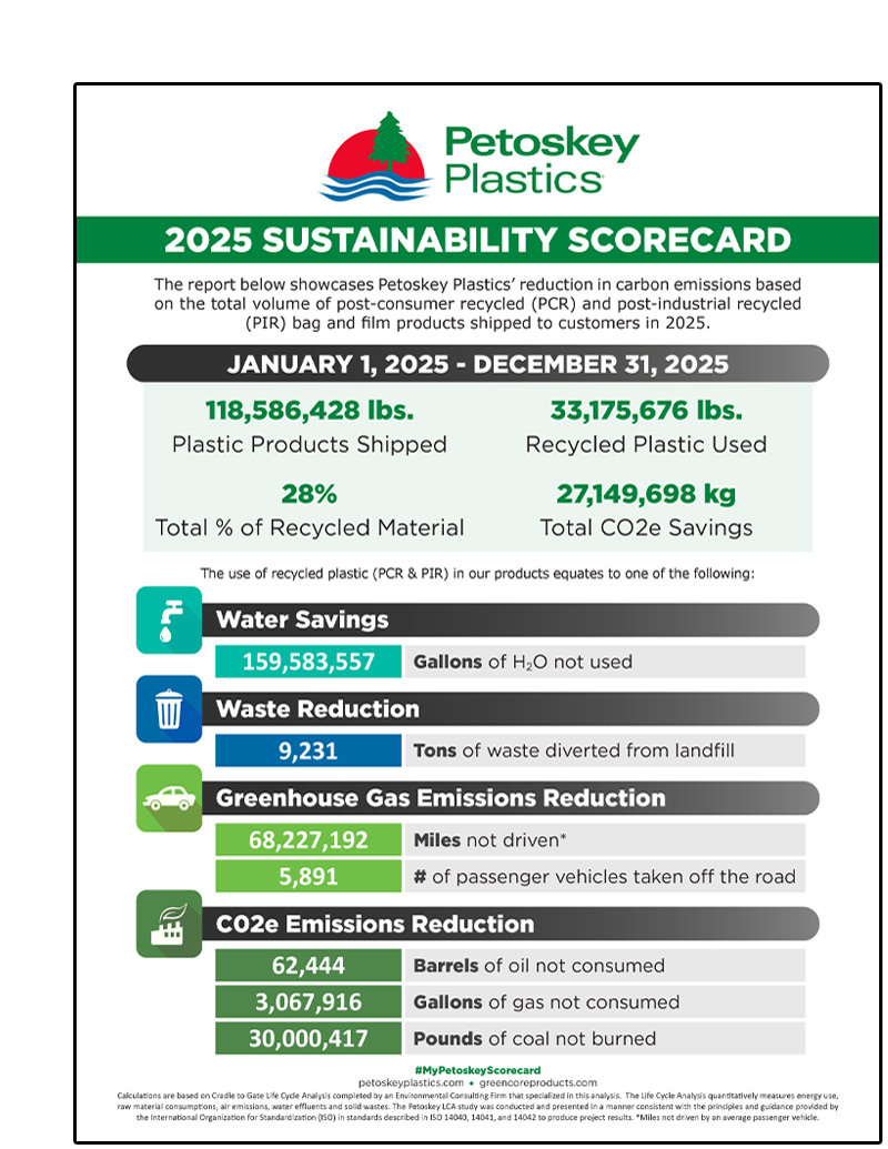 Petoskey Plastics offers innovative technology with our production of recycled LLDPE resin and use of recycled LLDPE resin PE films. To demonstrate commitment to sustainability and provide evidence of this accomplishment, we contracted a third party to complete a Life Cycle Assessment (LCA), or cradle-to-gate analysis of our recycled LLDPE resin and the use of the recycled LLDPE resin in PE films.